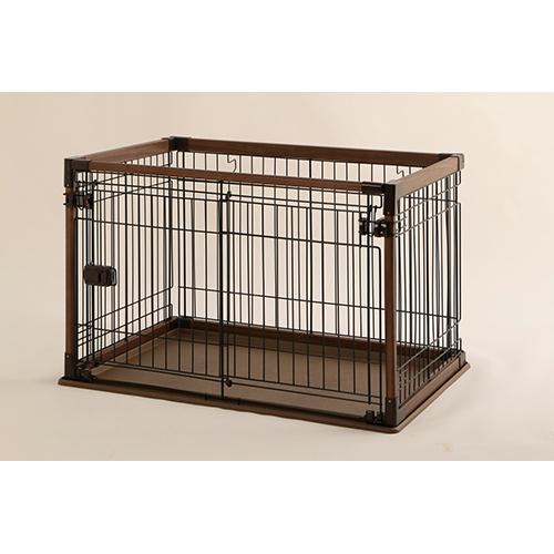 ■前パネルが取り外し可能なウッディサークルです。外したパネルは背面のフックに掛けておくことができます。お手入れ品やおやつ等を収納できるバスケットと給餌給水器付きです。ワンタッチピンを差し込むだけで工具不要で簡単に組み立てができます。スムーズに開閉できるらくらくスライド扉です。