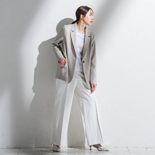 艶やかな微光沢と麻を思わせるナチュラルな表面感が上品で涼やかなテーラードジャケット。