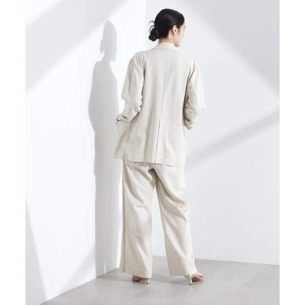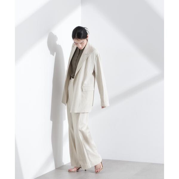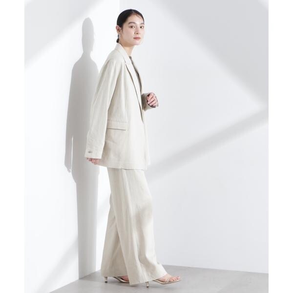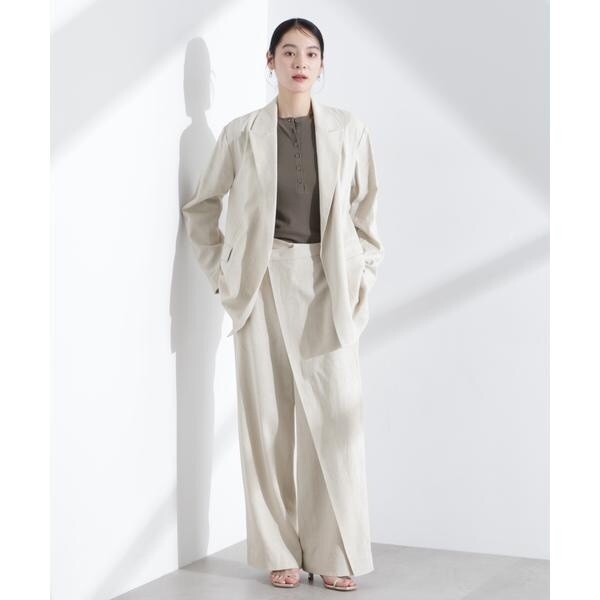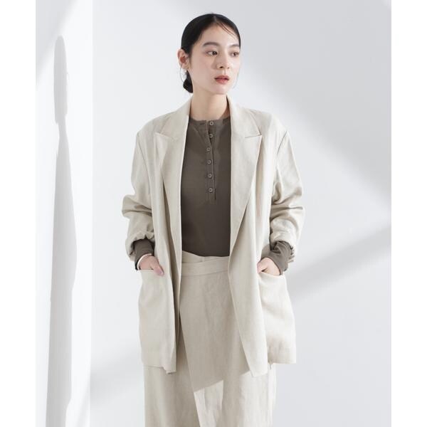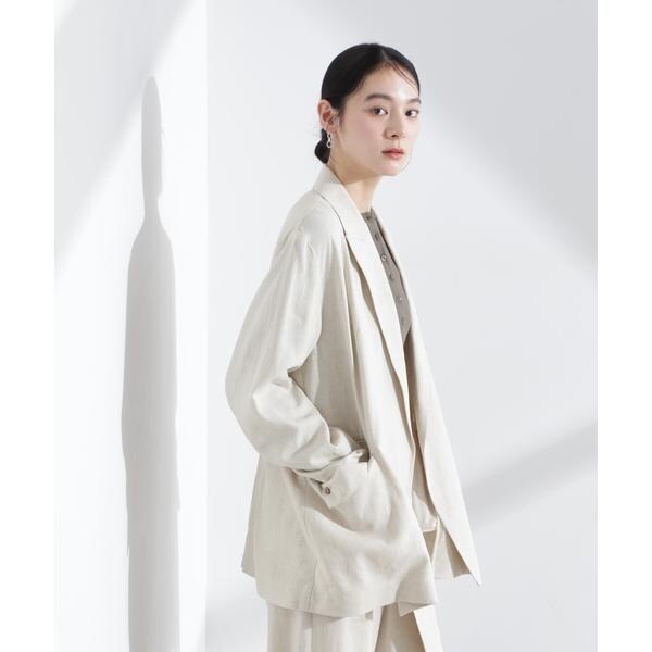 清涼感のあるリネン混素材のボタンレスジャケット。肩を落としたオーバーサイズで、リラックスムードの漂う一着。同素材展開のラップパンツとのこなれ感あるセットアップスタイルがおすすめです◎