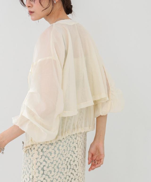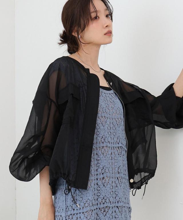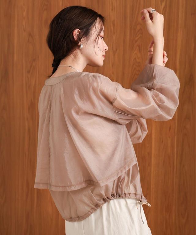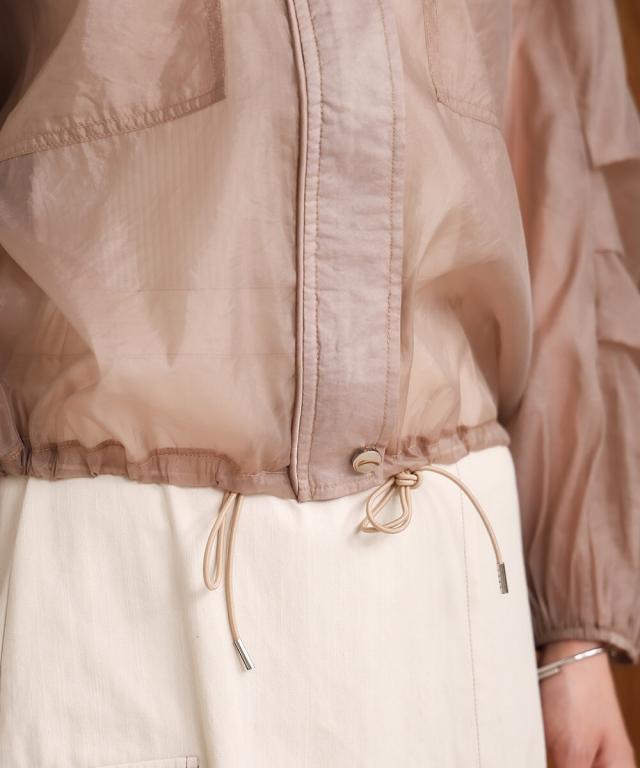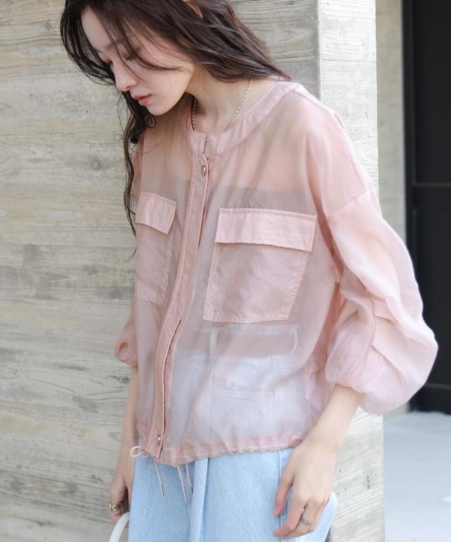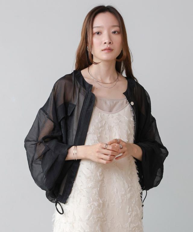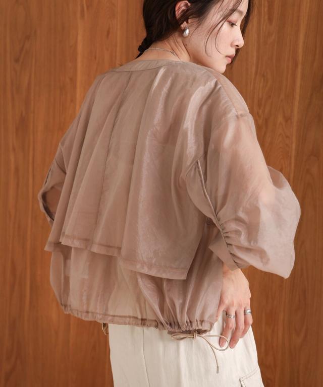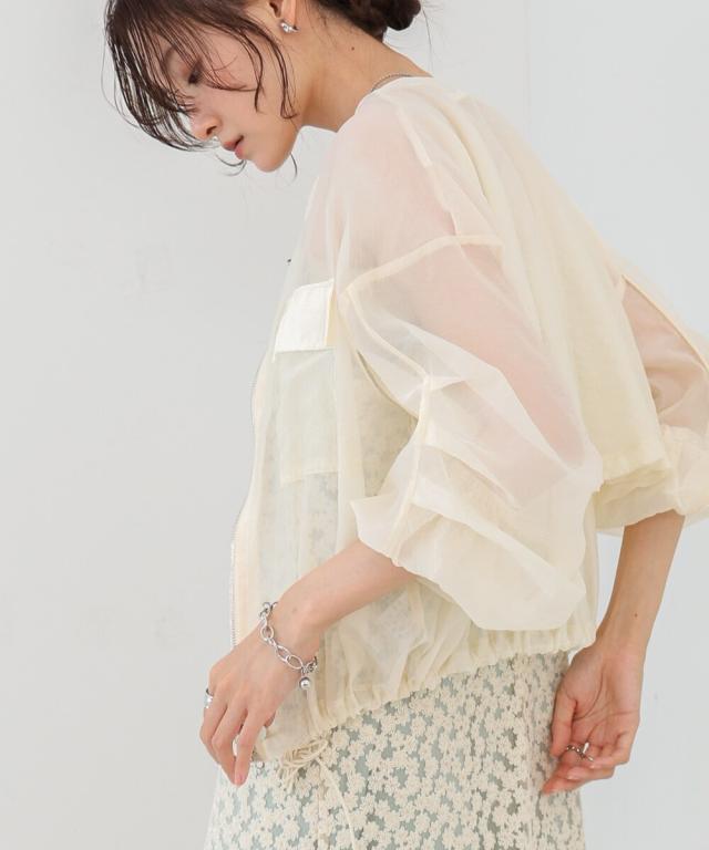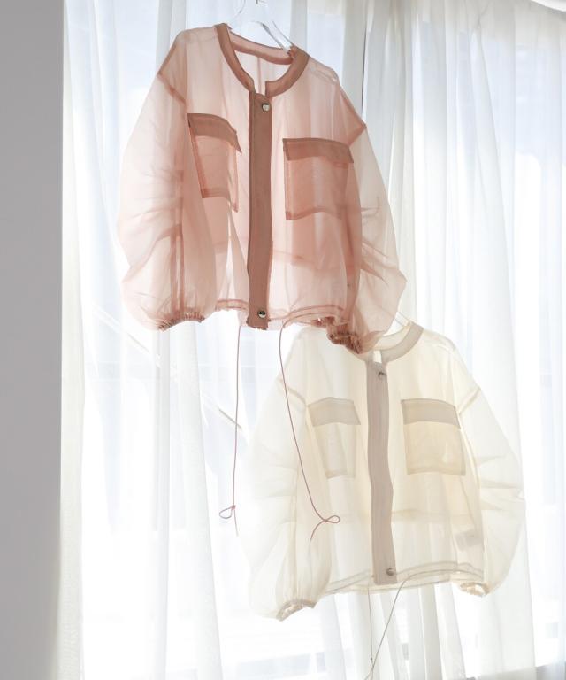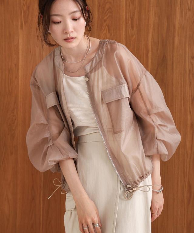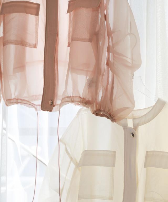 1枚羽織るだけでこなれ感を演出するシアーブルゾンの登場です。透明感のある綺麗なペールトーンの3色展開でシーズンムードが高まります。裾にぐるっと入った丸ゴムは好きな位置で結んで絞り具合を変えて頂ける仕様。袖口を捲り上げて手首を見せれば一気に抜け感のあるスタイルになります。ふらしのバックディティールで360度どこから見ても抜かりないデザインも好印象です。さり気ないパイピングもアクセントになり、ふわっとエアリー感のある生地が初夏までしっかりと活躍してくれるアイテムです。