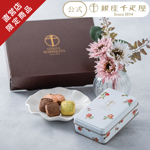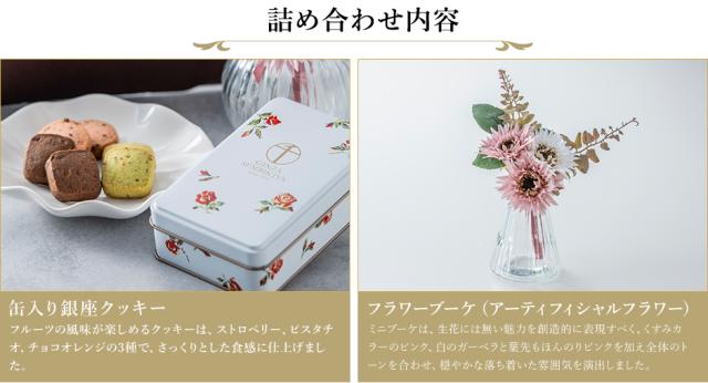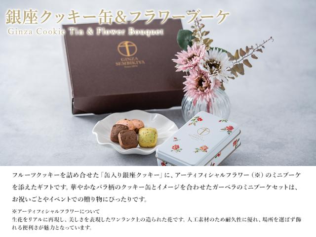 フルーツクッキーを詰め合せた「缶入り銀座クッキー」に、アーティフィシャルフラワーのミニブーケを添えたギフトです。