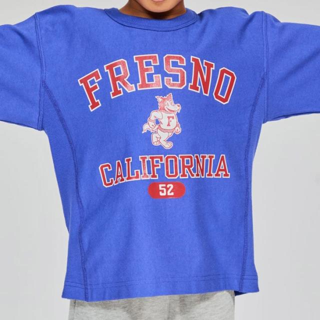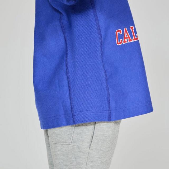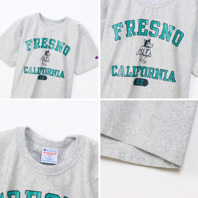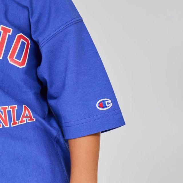 前身頃のプリントはChampionブランドと親和性の高いカレッジ風グラフィックを現代に落とし込んだもので、