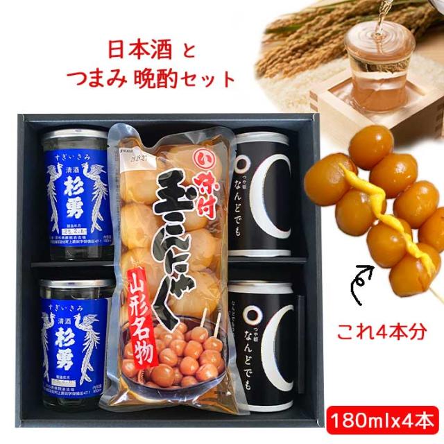 お歳暮 冬ギフト 山形 日本酒 飲み比べ アルミ缶 カップ酒 すぐ食べられるおつまみセット 180mlx4本( 杉勇鳳凰カップ2本x東の麓なんどでもアルミ缶2本x玉こん2袋) 3000円台 晩酌セット