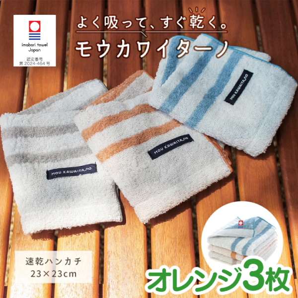 【メール便選択で送料無料】今治タオル ハンカチ モウカワイターノ オレンジ 3枚 速乾タオル