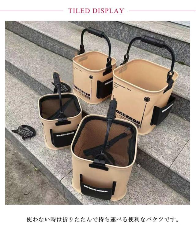 | 釣りやアウトドアで使える水汲みバケツ。メッシュ状の蓋付きで魚が飛び出すこともありません。 使わない時は折りたたんで持ち運べる便利なバケツです。 どんな場所でも手軽に利用できる折りたたみバケツが便利!釣りに!飲み物を冷やすのに! メッシュ上の蓋付きで収納ボックスとしても利用が可能! 持ちやすさを重視したグリップ式のハンドル! | |
