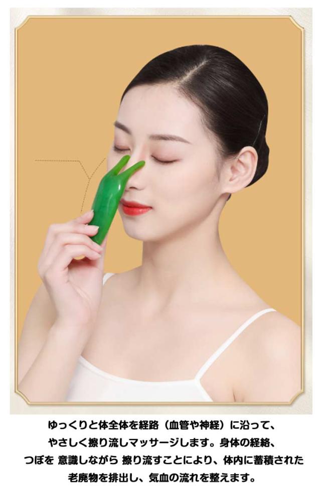 | 【かっさ棒】 【目もと・鼻筋・頭皮】 手馴染みがよく握りやすいツボ押しマッサージ用かっさ棒です。 2つの突起部分は、鼻のマッサージに使用します 女性の顔にピッタリサイズ ゆっくりと体全体を経路(血管や神経)に沿って、やさしく擦り流しマッサージします。身体の経絡、つぼを 意識しながら 擦り流すことにより、体内に蓄積された老廃物を排出し、気血の流れを整えます。 特殊な突起がやさしく刺激&心地いい 頭皮・目もとフェイスラインなどにフェイス&ボディにも使える | |