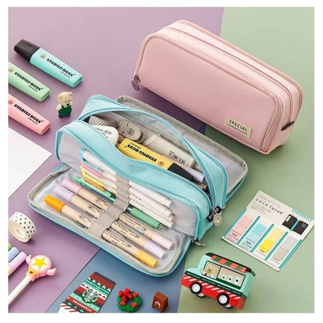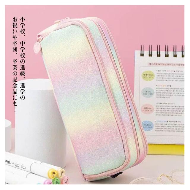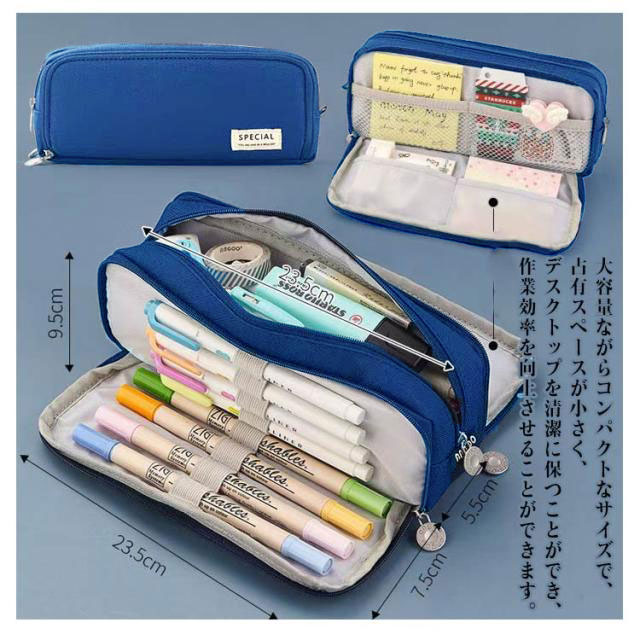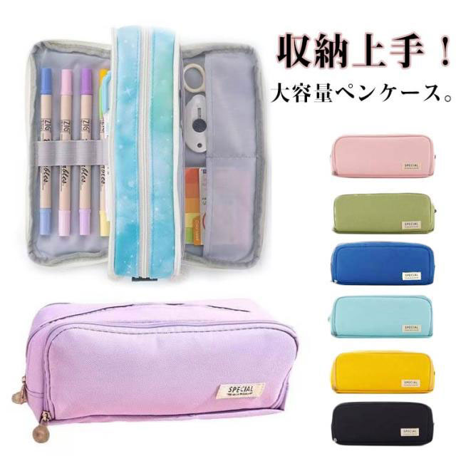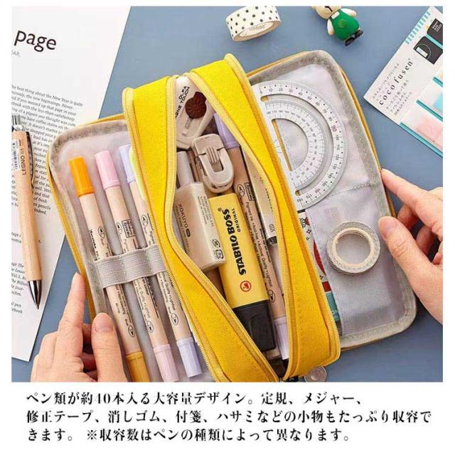 | 収納上手!大容量ペンケース。 この筆箱は両側から開くことができ、文房具がはっきりと見えるので、取りやすくなります。 メッシュポケットやペンホルダー付きポケット、メインポケットなどポケットがたくさん、さまざまな文房具を分類して収納することができ、小物を見つけやすくなります。 ペン類が約40本入る大容量デザイン。定規、メジャー、修正テープ、消しゴム、付箋、ハサミなどの小物もたっぷり収容できます。 ※収容数はペンの種類によって異なります。 大容量ながらコンパクトなサイズで、占有スペースが小さく、デスクトップを清潔に保つことができ、作業効率を向上させることができます。 小学校、中学校の進級、進学のお祝いや卒団、卒業の記念品にも! | |