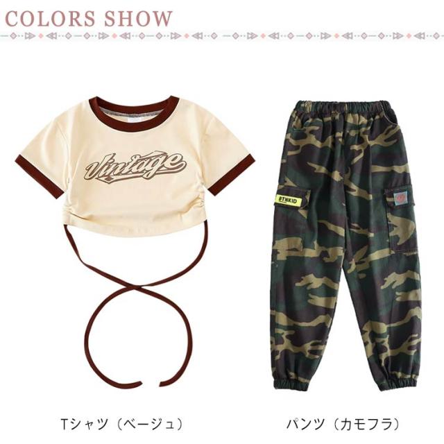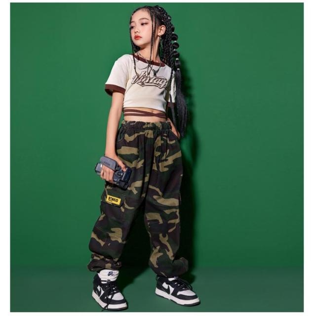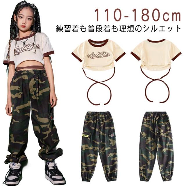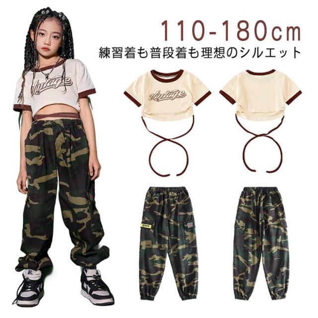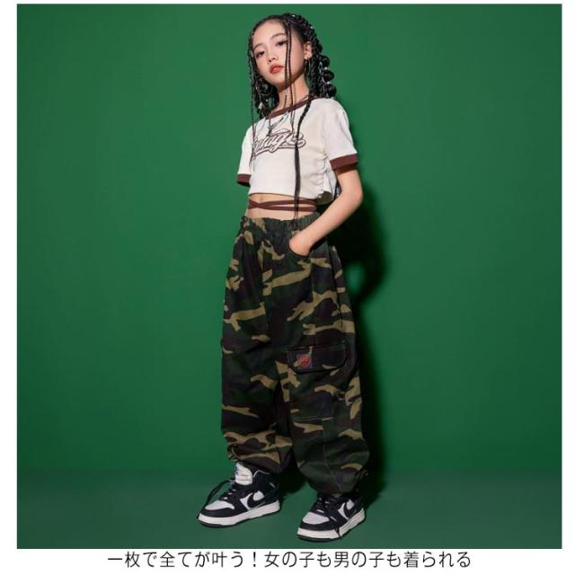 キッズ ダンス 衣装 迷彩 パンツ カーゴパンツ Tシャツ 半袖 練習着 キッズダンス衣装 緑 グリーン 黒 ブラック ヒップホップ 子供 ロング丈 子ども ストリート カモフラージュ 女の子 男の子 kpop