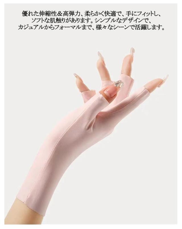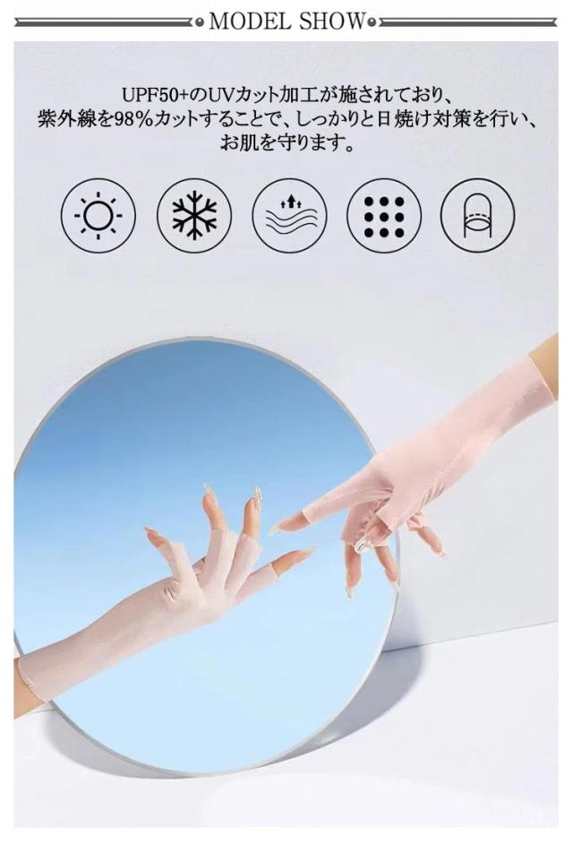 | 【指なしUV手袋】【UPF50+】【涼感素材】 UPF50+のUVカット加工が施されており、紫外線を98%カットすることで、しっかりと日焼け対策を行い、お肌を守ります。 接触冷感素材を採用しているため、暑い夏でも、手袋を着用することで快適にお過ごしいただけます。 少し長めのデザインなので、手首部分までしっかりガードしますので日焼け対策にもおススメ。 指なしタイプなので、スマートフォンの操作がスムーズに行えます。また、手首までしっかりと覆うデザインなので、夏場の紫外線対策だけでなく、室内での冷え取り対策にも最適です。 優れた伸縮性&高弾力、柔らかく快適で、手にフィットし、ソフトな肌触りがあります。シンプルなデザインで、カジュアルからフォーマルまで、様々なシーンで活躍します。 | |