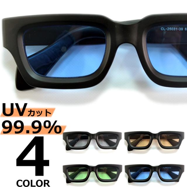 サングラス 伊達メガネ メンズ レディース UVカット スクエア 極厚 分厚いフレーム ライトカラーレンズ 薄い色 ブラック グレー ブルー グリーン 全4色