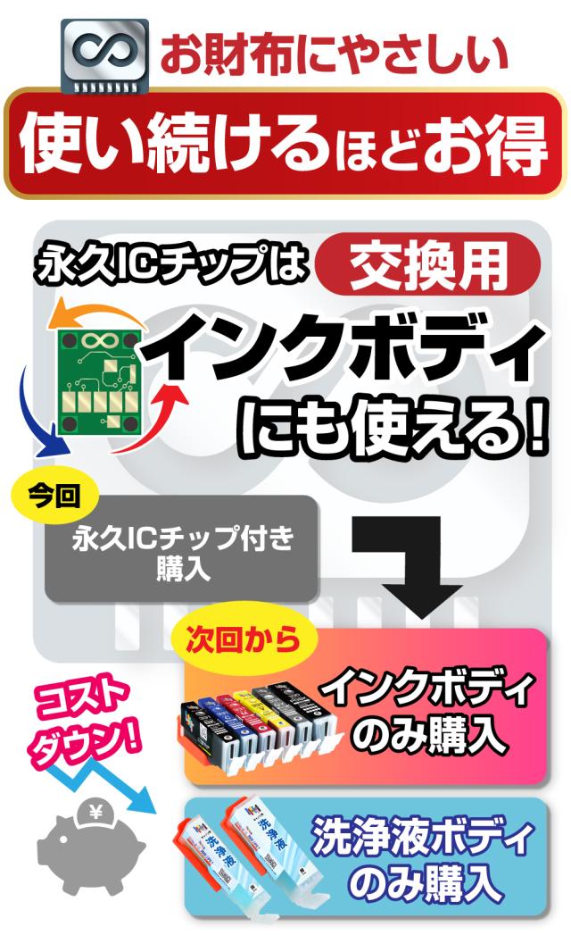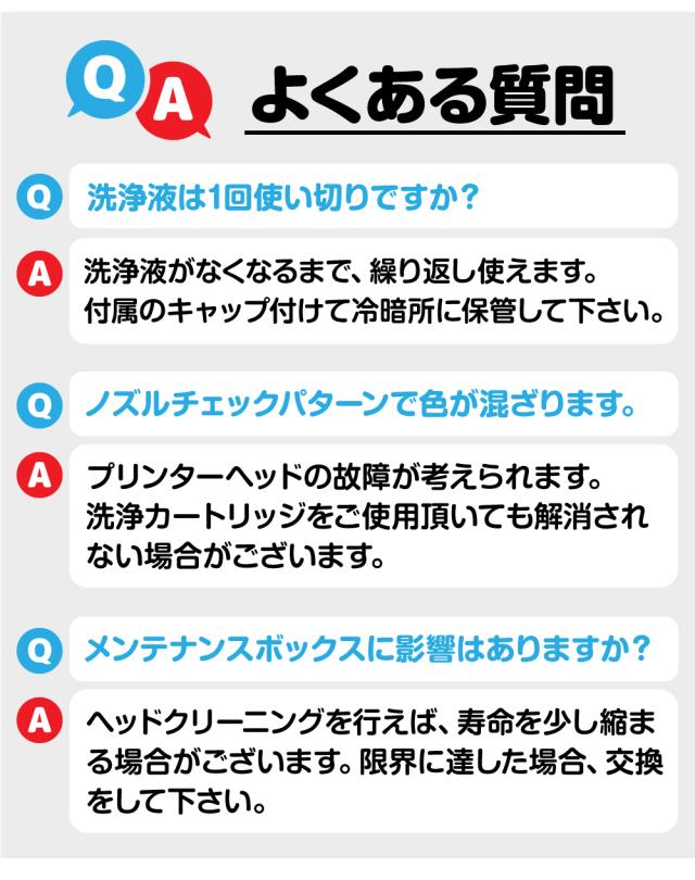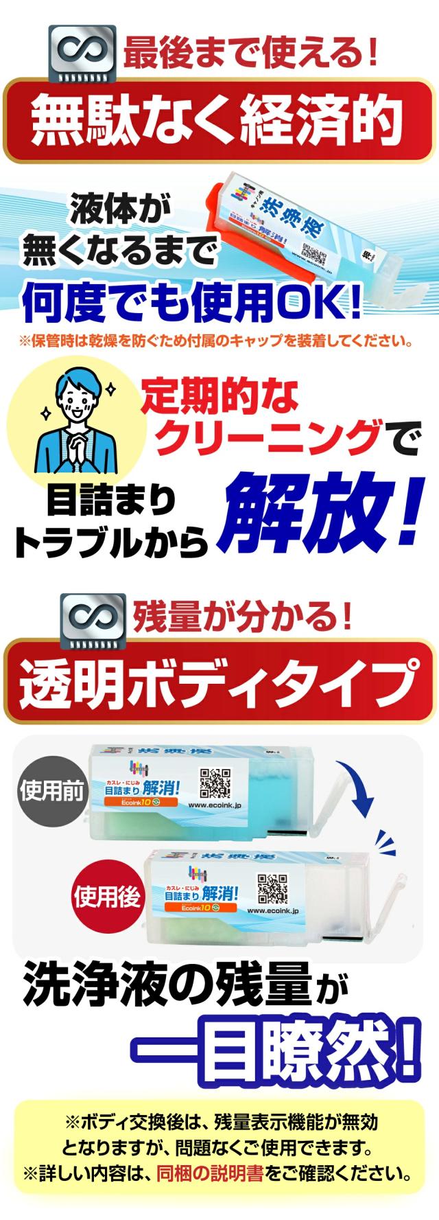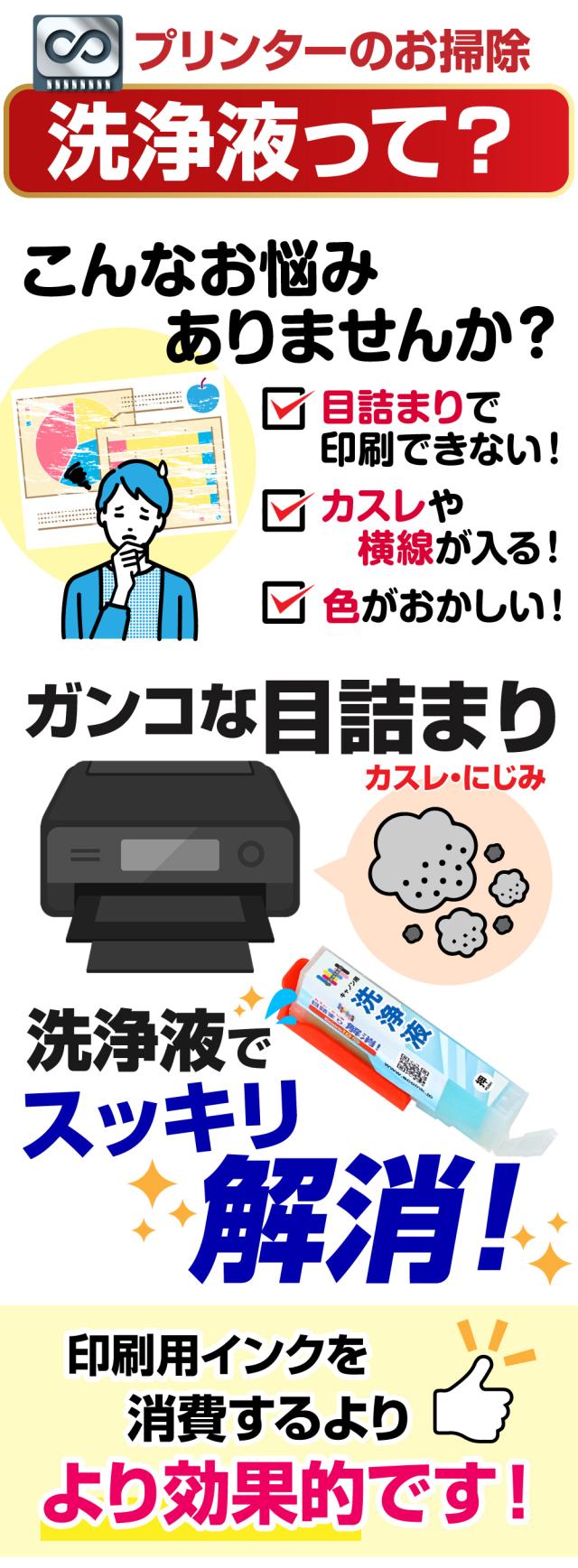 | インクの目詰まりやカスレを洗浄解消する、繰り返し使える永久ICチップ付きの洗浄液カートリッジです。 | |