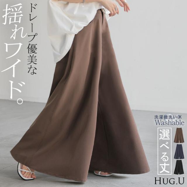 パンツ ワイド レディース ワイドパンツ ロング ロングパンツ フレア フレアパンツ 体型カバー ボトムス ボトム ストレート ズボン ゆったり ハイウエスト ストレッチ シワになりにくい 美脚 Aライン ゴム 大きいサイズ 黒 ネイビー 春 夏 HUG.U 秋新作