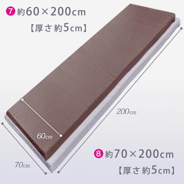 ごろ寝マットレス 【選べる8サイズ】 【カーシート・ソファ向け】 1 :約50×100×約5cm 製品許容範囲+3%-5% 2 :約50×150×約5cm 製品許容範囲+3%-5% 【子供用・ペット向け】 3 :約70×120×約5cm 製品許容範囲+3%-5% 4 :約80×130×約5cm 製品許容範囲+3%-5% 【ロングサイズ】 7 :約60×200×約5cm 製品許容範囲+3%-5% 8 :約70×200×約5cm 製品許容範囲+3%-5% |