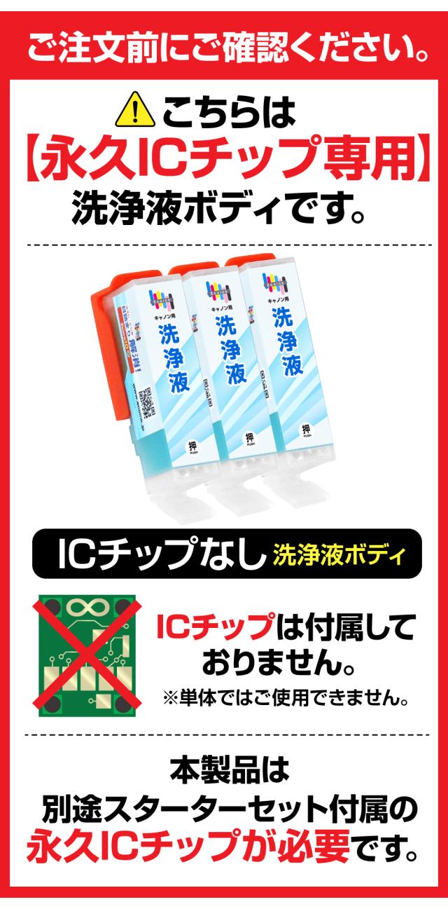 | 繰り返し使える永久ICチップ専用の交換用洗浄液インクカートリッジです。別途永久ICチップ付き洗浄液セットが必要になります。 本製品だけでは、ご使用になれませんので予めご了承ください。 |