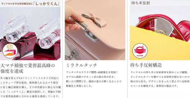 | 備考 | ■肩ベルト:らくふわベルト ■チェストベルト付き ■反射材:かぶせ、持ち手、肩ベルト、大マチ ■補強:しっかりくん ■背カン:フィットちゃん ■錠前:ミラクルタッチ |