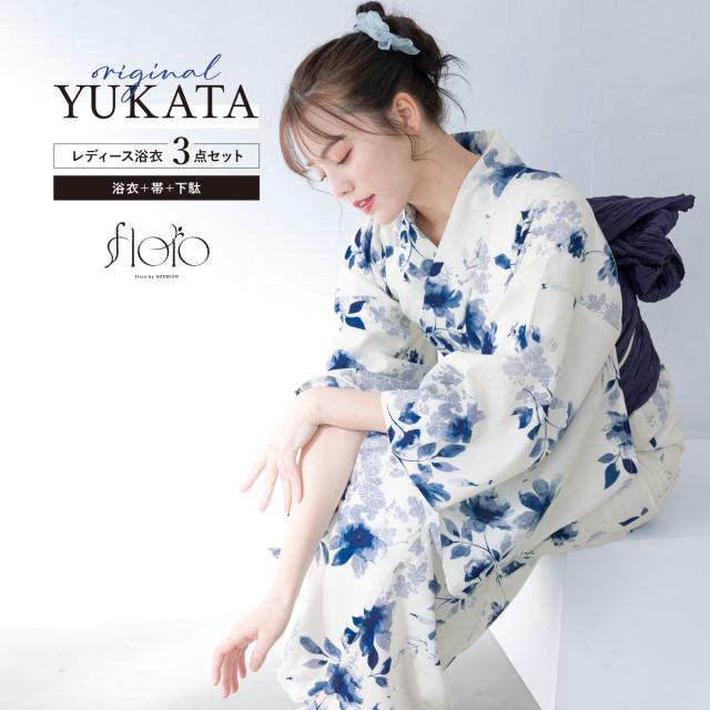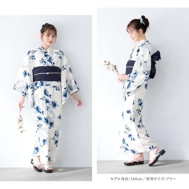 浴衣 セット レディース 浴衣セット 兵児帯 2025 floro 簡単 涼しい 白 青 藍 紺 花柄 おしゃれ 可愛い 下駄 S フリー 送料無料