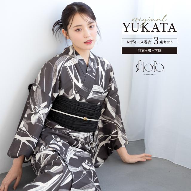 浴衣 セット レディース 浴衣セット 兵児帯 2025 floro 簡単 涼しい 黒 焦茶 桔梗 花柄 おしゃれ 可愛い 下駄 S フリー 送料無料