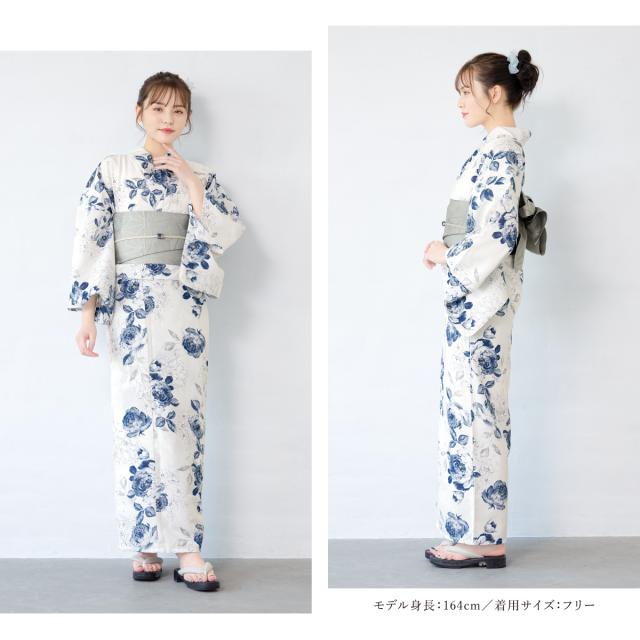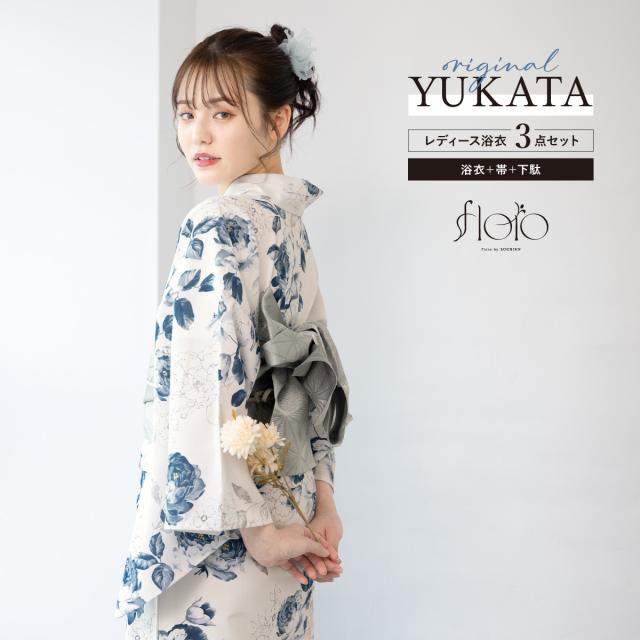 浴衣 セット レディース 浴衣セット 半幅帯 2025 floro 簡単 涼しい 白 青 紺 グレー 花 おしゃれ 可愛い 下駄 S フリー 送料無料
