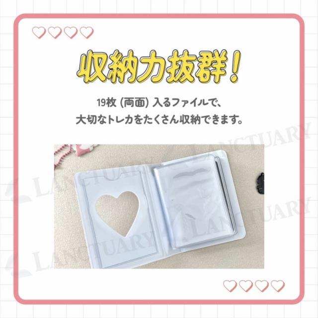 SNSで人気爆発中のこの商品は、キュートなデザインと機能性を兼ね備えた、まさに推し活に欠かせないアイテムです。最大の特徴は、表紙に付いたハート型の窓。お気に入りのトレカをセットすれば、いつでも推しを眺めることができます。