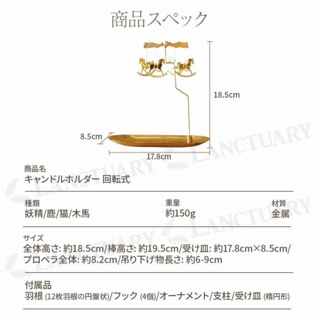 | 主な仕様 | 商品名: キャンドルホルダー 回転式 種類: 妖精、鹿、猫、木馬 サイズ: 全体高さ 約18.5cm、棒高さ 約19.5cm、受け皿 約17.8cm × 8.5cm、プロペラ全体 約8.2cm、吊り下げ物長さ 約6-9cm 重量: 約150g 材質: 金属 付属品: 羽根 (12枚羽根の円盤状)、フック (4個)、オーナメント (種類によって異なる)、支柱、受け皿 (楕円形) |