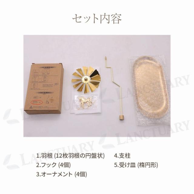付属品: 羽根 (12枚羽根の円盤状)、フック (4個)、オーナメント (種類によって異なる)、支柱、受け皿 (楕円形)