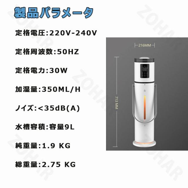 【2】超音波加湿9L大容量:超微細ミストを吹出し、最大36時間連続加湿、結露床濡れ頻繁給水心配なし