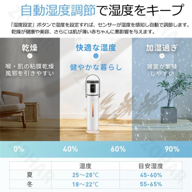 【5】室内湿度をコントロール:設定した湿度超えると、加湿を自動停止、加湿過ぎ防止、設定した湿度復帰すると、加湿を自動起動します。