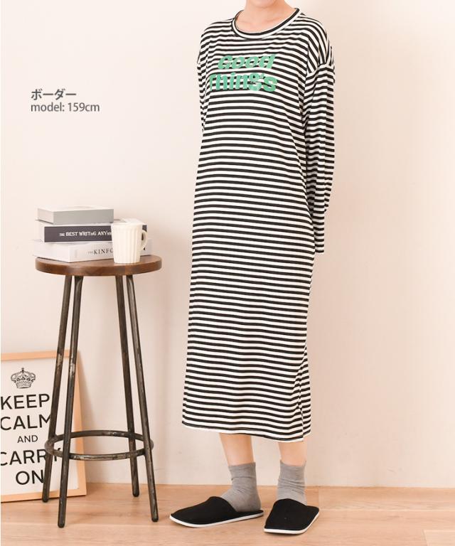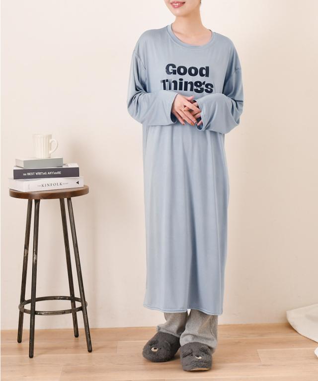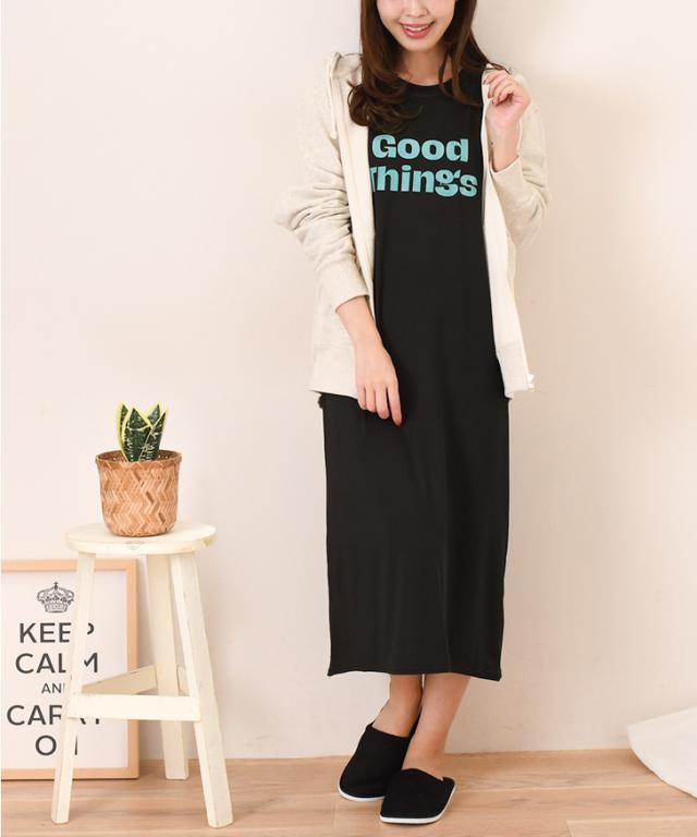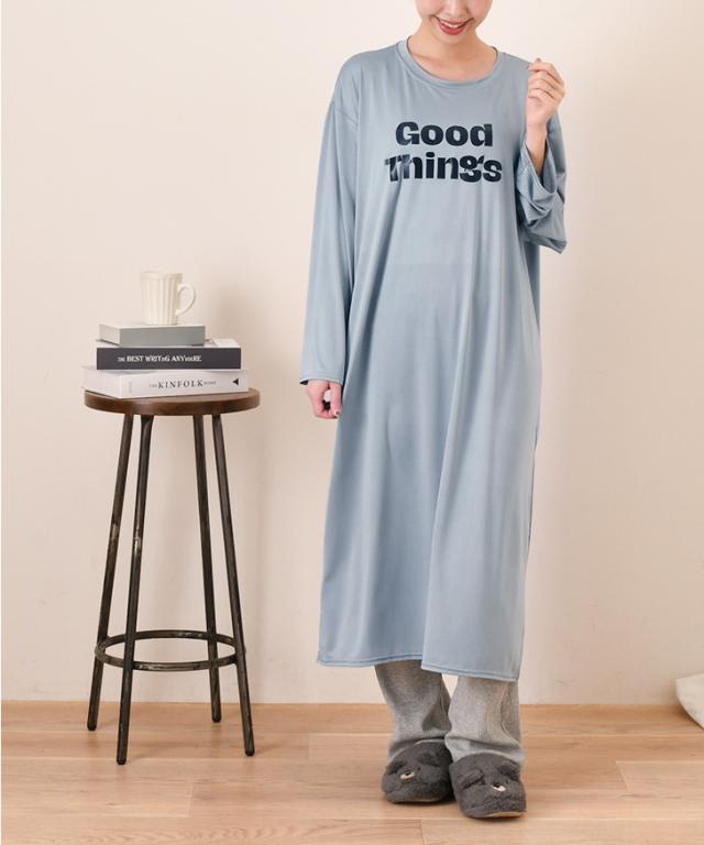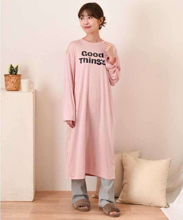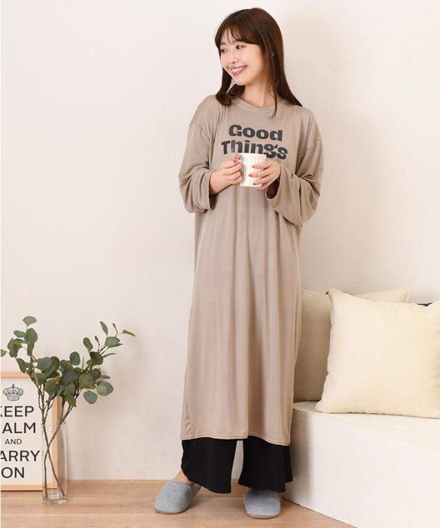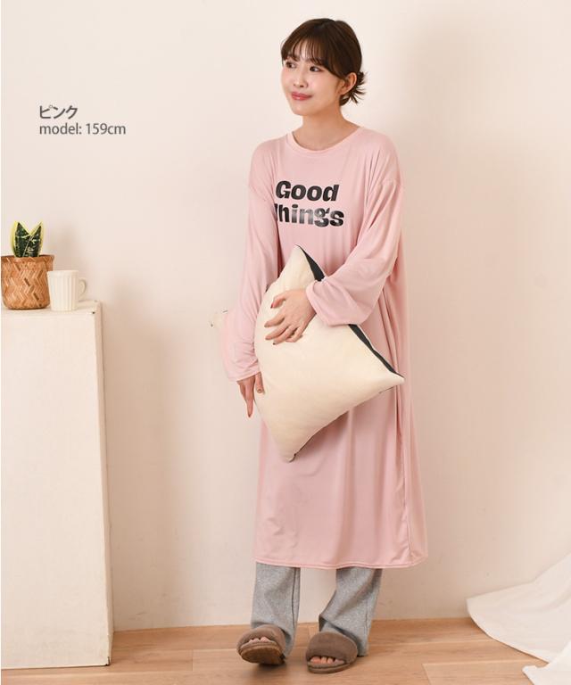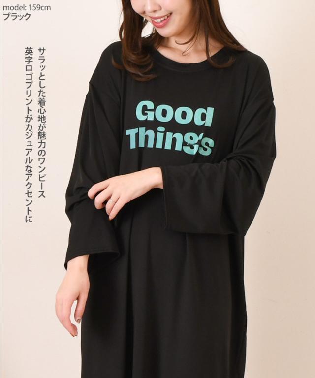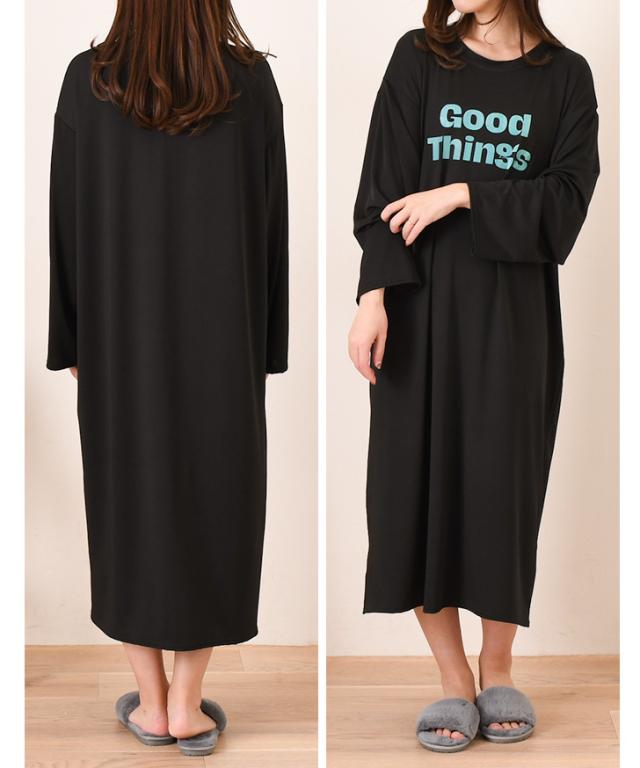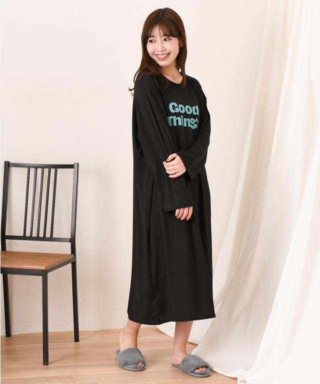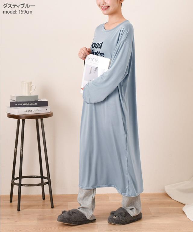 新作 ロゴプリントゆるてろリラックスルームロングワンピース レディース 長袖 春 夏 部屋着 ルームウェア 薄手 低身長 高身長 ミモレ丈 膝下 ひざ下 Iライン ゆったり おしゃれ カジュアル 楽ちん 丸首 大人