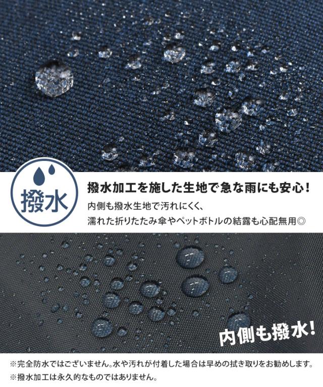 内側も撥水生地で汚れにくく、濡れた折りたたみ傘やペットボトルの結露も心配無用◎