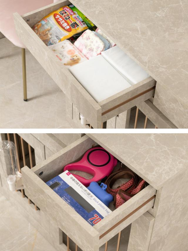 大きな引出しには、ペットシーツや食品などたくさん収納できます。小さい引出しには、リードやお散歩用の小物などが収納できます。
