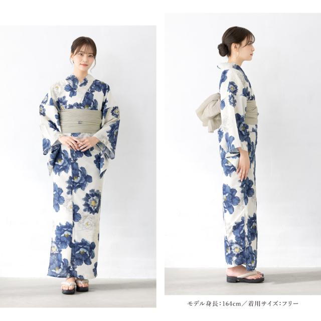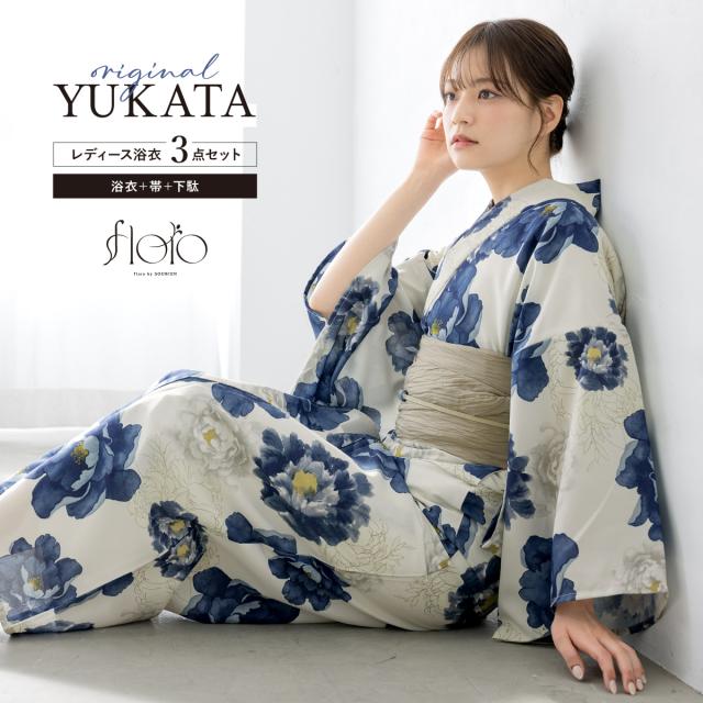 浴衣 セット レディース 浴衣セット 兵児帯 2025 floro 簡単 涼しい 白 紺 グレージュ 花 おしゃれ 可愛い 下駄 S フリー 送料無料