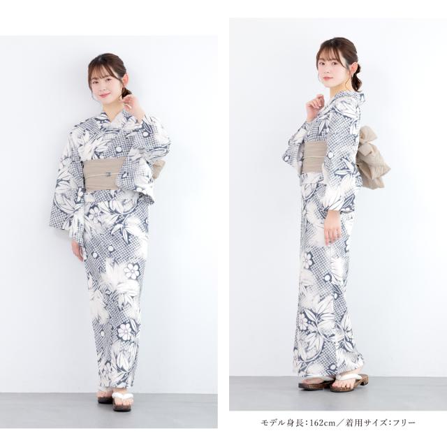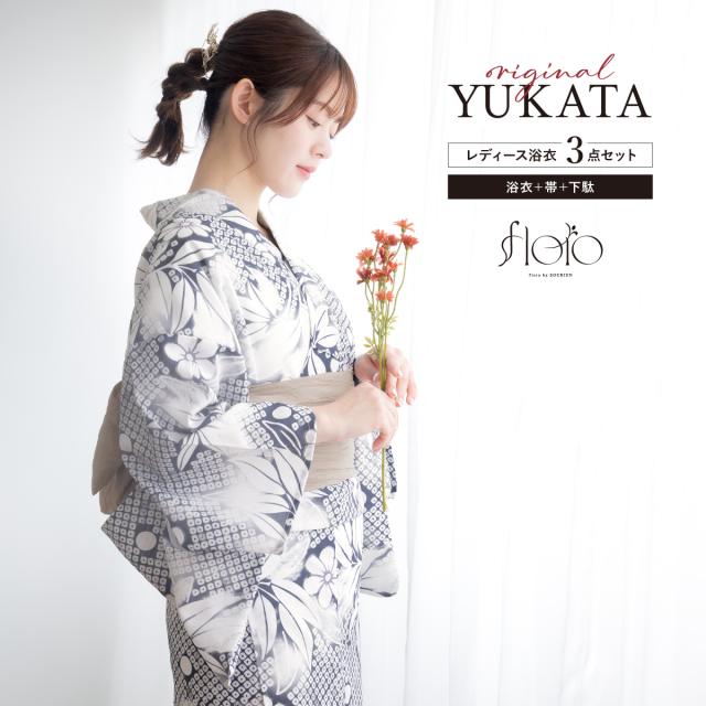 浴衣 セット レディース 浴衣セット 兵児帯 2025 floro 簡単 涼しい 白 紺 茶 花柄 おしゃれ 可愛い 下駄 S フリー 送料無料