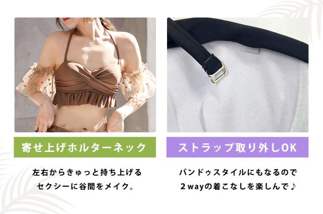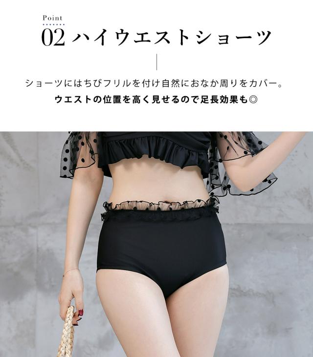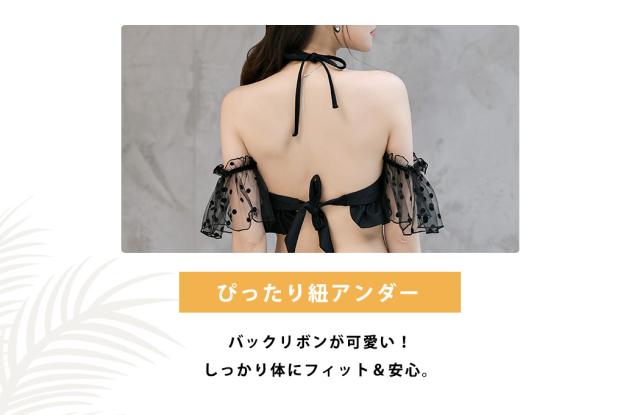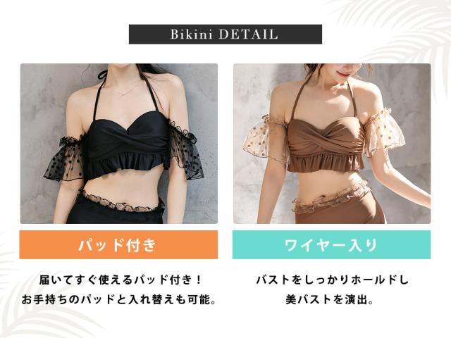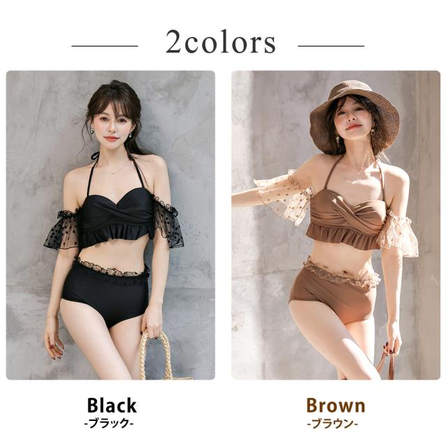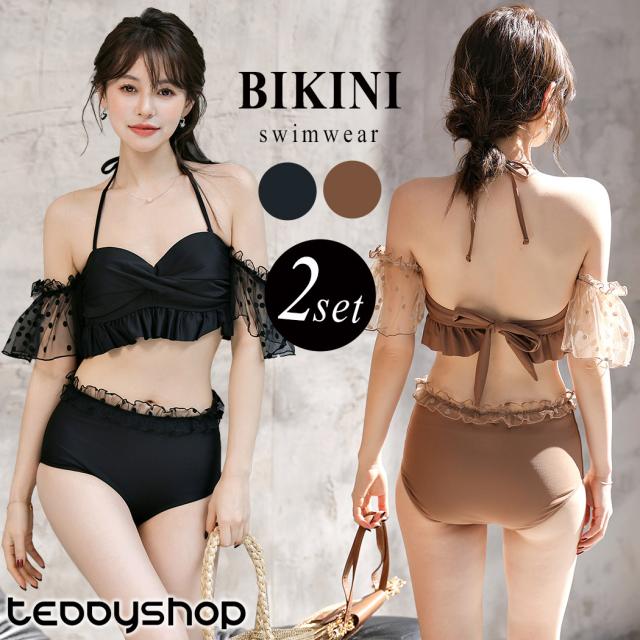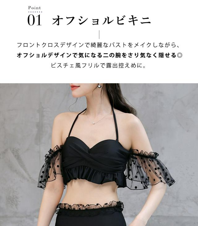 ビキニ 水着 レディース ハイウエスト 2点セット オフショルダー チュール シアー ドット柄 フリル ワイヤー入り ホルターネック 2way 肩紐 取り外し バンドゥ バックリボン フロント クロス パット 盛れる 二の腕 ウエスト カバーアップ 黒