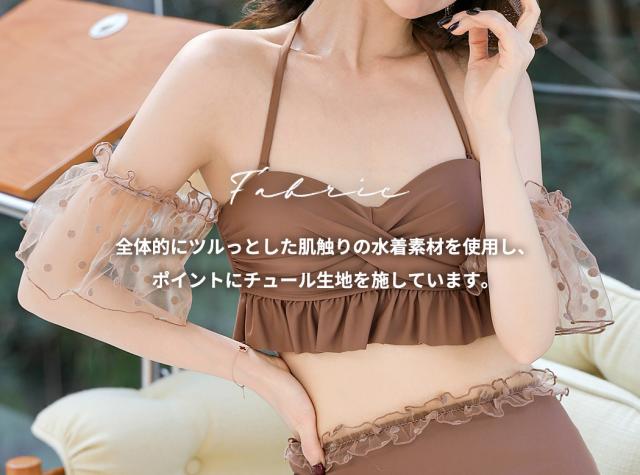 全体的にツルっとした肌触りの水着素材を使用し、ポイントにチュール生地を施しています。