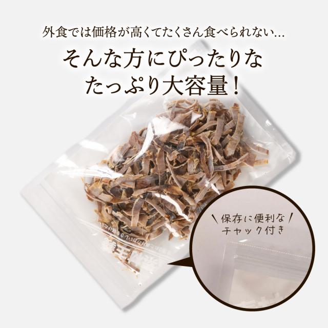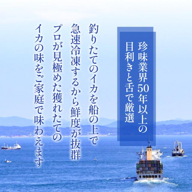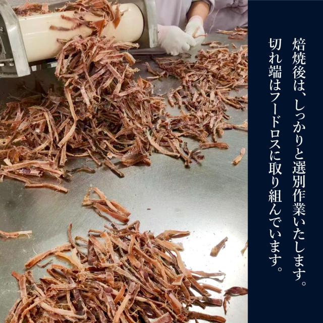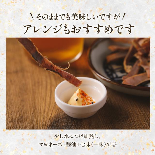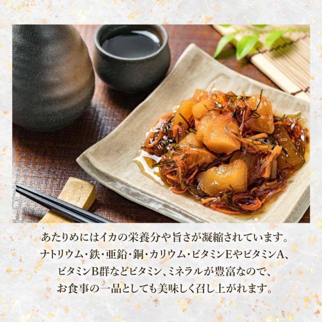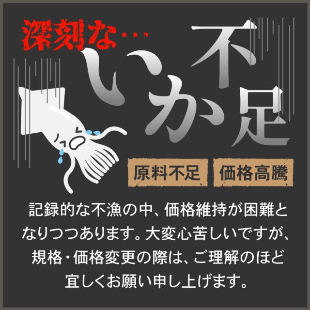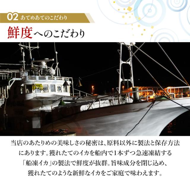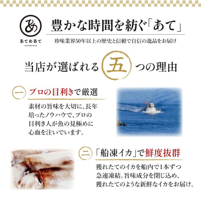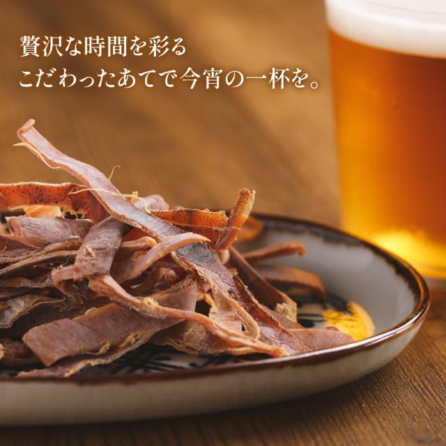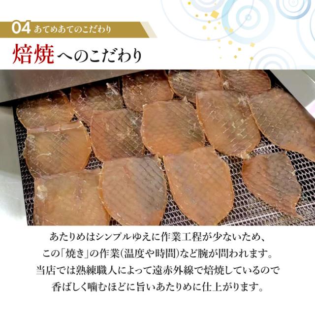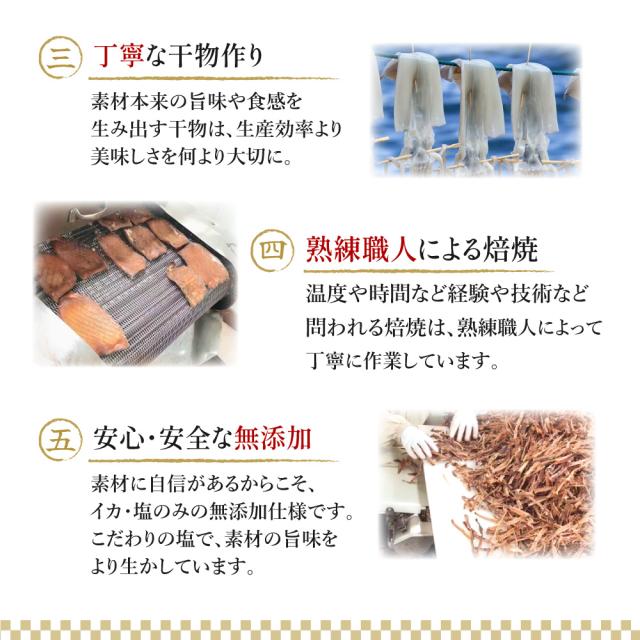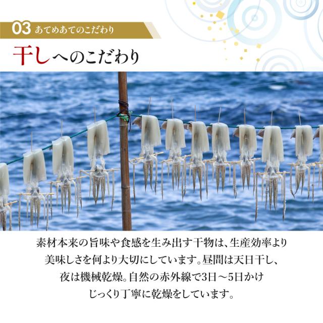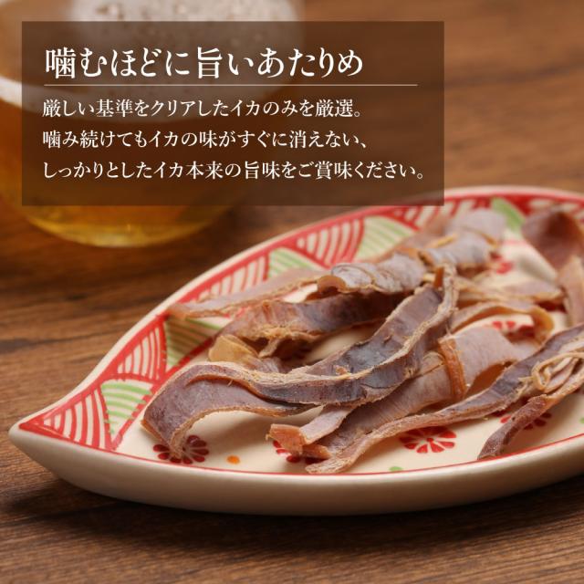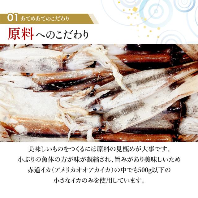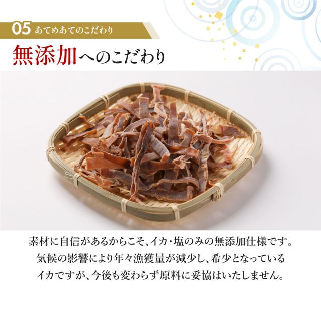 原材料はいかと塩のみの無添加あたりめ。シンプルが故に、原料いかによって味が左右されるあたりめは熟練の目利きで特に時間をかけて原料を選びます。噛み続ける程にいかの旨みが味わえる、そんなあたりめを厳選しました。お酒の「あて」はもちろん、お子様のおやつにも人気です。