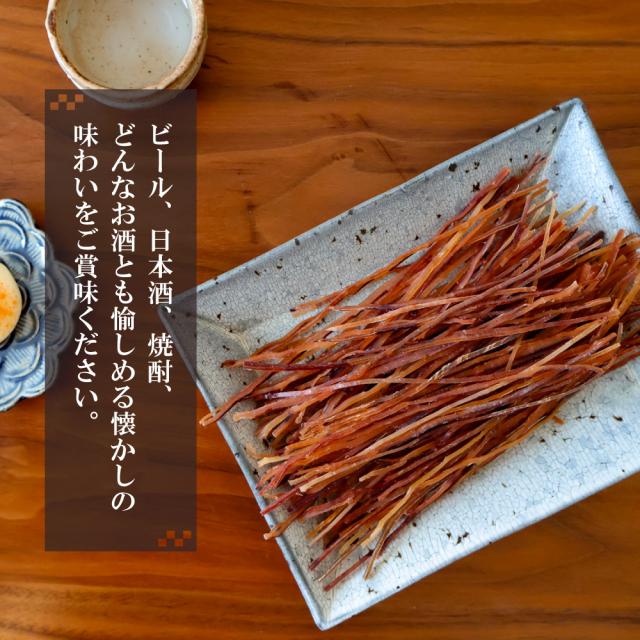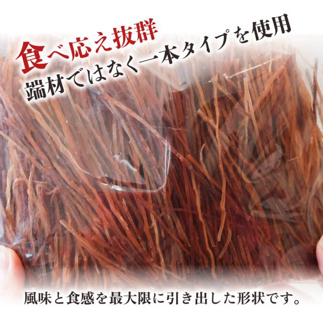懐かしい味わいで駄菓子珍味の定番のするめソーメン。どっさり500gと大容量で食べ応えも抜群、業務用にも最適な商品です。端材ではなく一本タイプのイカの耳を贅沢に使用しており、イカの旨みとコリコリ食感を愉しんでいただけます。また約1mm巾にカットされているのでどこでも手軽に楽しめ、酒の肴だけでなくお子様のおやつにもおススメです。チャック付きのパッケージで湿気や酸化を防ぎ、鮮度を保ちます。