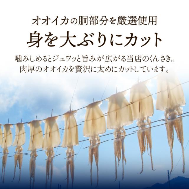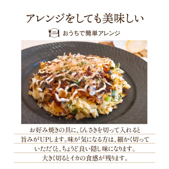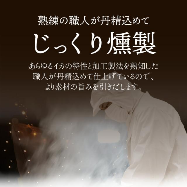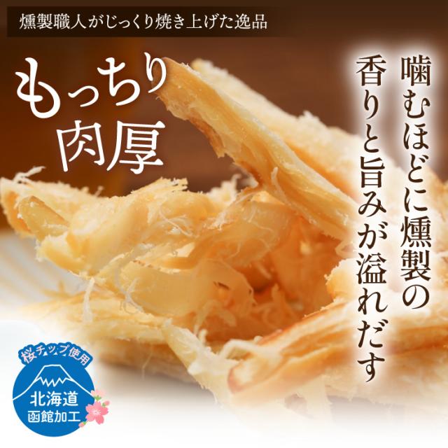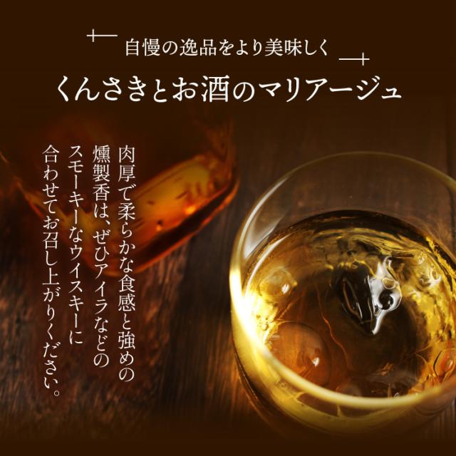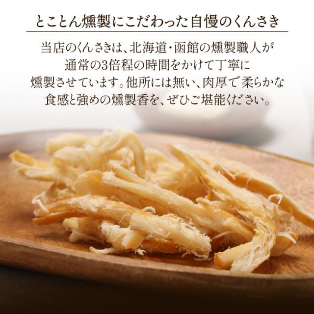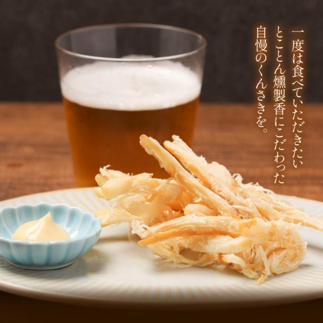 燻製好きの方に是非とも食べて頂きたい、くんさきです。厳選したいか原料を函館にて調味・燻製しました。他所には無い、より燻製香の強いくんさきを目指してじっくりと時間をかけて燻製。肉厚で柔らかな食感と強めの燻製香は、是非アイラ等のスモーキーなウイスキーに合わせてお召し上がりください。