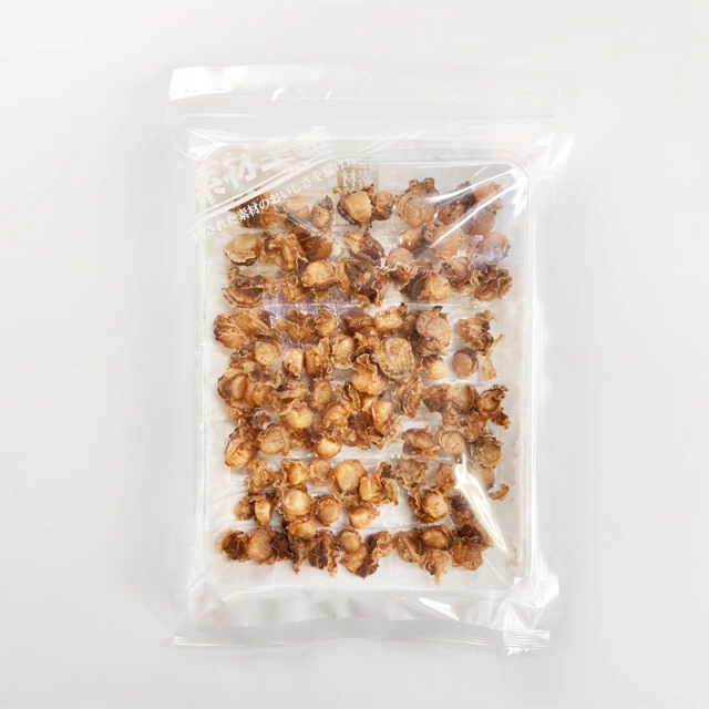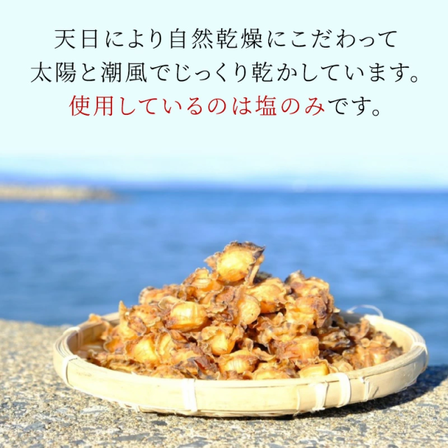 青森県陸奥湾で育った帆立を使用。水揚げしたその日の内に貝ひもも付いたまま加工、処理して鮮度を保っています。原材料は帆立と塩のみ、太陽と潮風による自然乾燥でじっくりと旨みを閉じ込めます。そのままでじっくり噛みしめてお酒の「あて」にももちろん、炊き込みごはんやスープなど水分で戻すことで帆立本来の旨みが広がります。