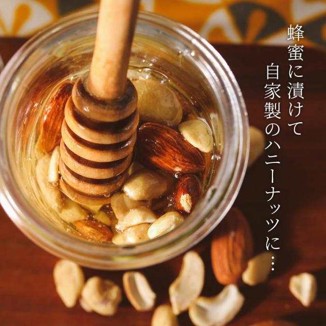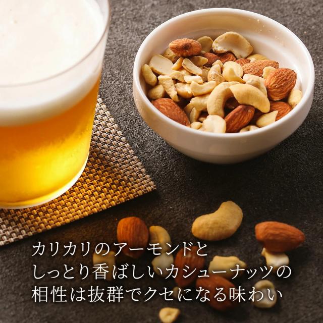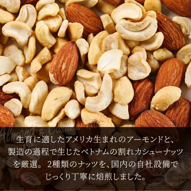 生育に適したアメリカ生まれのアーモンドと、製造の過程で生じたベトナムの割れカシューナッツを厳選。2種類のナッツを、数多くのナッツ加工を行ってきた国内の自社設備でじっくり丁寧に焙煎しました。カリカリのアーモンドとしっとり香ばしいカシューナッツの相性は抜群でクセになる味わいです。