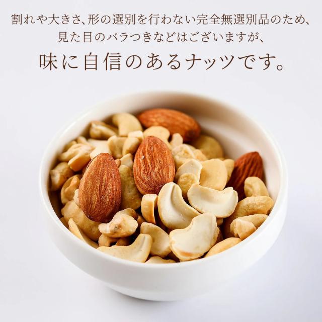 割れや大きさや形の選別を行わない完全無選別品の為、見た目のバラつきなどはございますが、味に自信のあるナッツです。無選別だから出来たとってもお得なナッツ、80gごとの個包装なので持ち運びにも便利です。