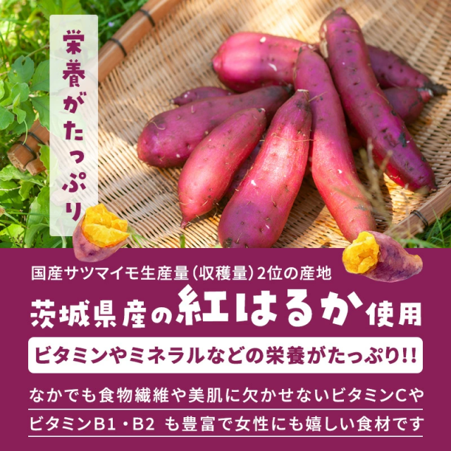 今大注目のさつま芋の産地、茨城県産の紅はるか品種を使用した干し芋です。食物繊維や栄養奏がたっぷりで女性にも人気の完熟したさつま芋を贅沢に使いました。