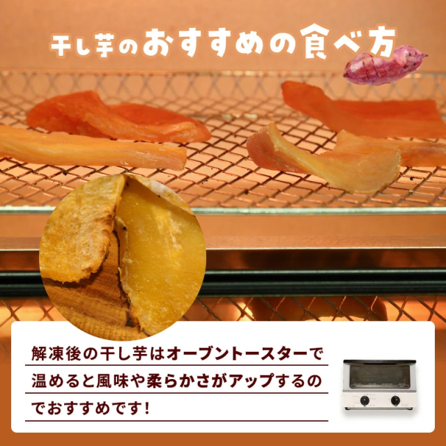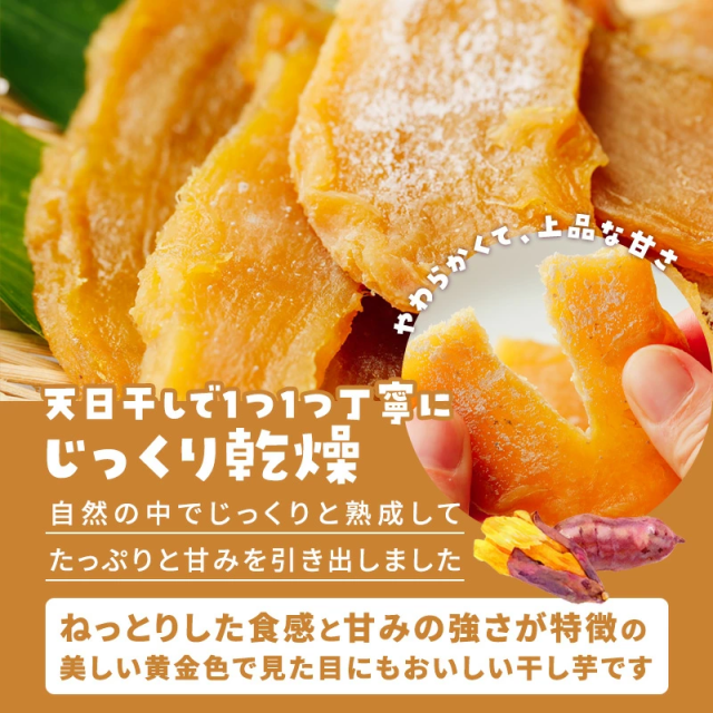 地元農家さん一軒一軒と契約して、安心できる芋だけ選定。収穫後は糖度を高める為に熟成、それを天日干しでじっくり1枚ずつ乾燥して甘みを最大限引き出しました。ねっとりとした食感と黄金色が特長、やわらかで噛むほどに芋本来が持つ自然のやさしい甘さを感じる事ができます。もちろん、添加物を一切使用していない完全無添加、完全自然食なので、保存は開封後冷蔵庫や冷凍庫でお願いします。