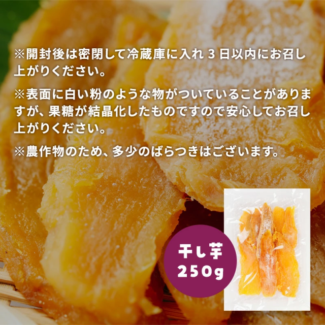 当店の干し芋の特長は昔ながらの「お芋のホクホク感」が若干感じられるように「厚切りカット」「じっくり天日干し」で仕上げています。水分値が高いねっとり系干し芋に比べて比較的表面の果糖の結晶化(白い粉のような物)が出やすいですが、これは原料であるさつまいもの糖度が非常に高い証明でもあるので、安心してお召し上がりください。さつまいも本来のホクホク感が残ったこれぞ元祖干し芋、農家の方の自信作を是非お召し上がりください!