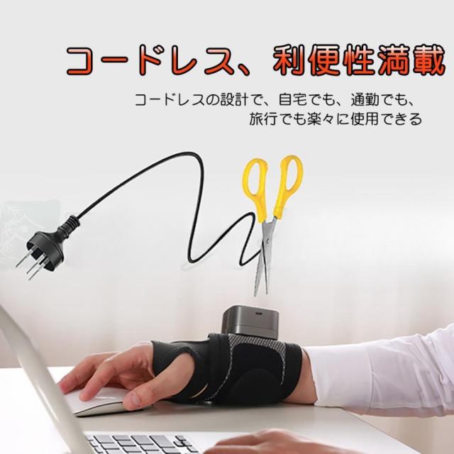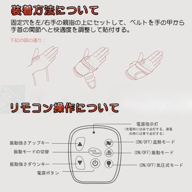 【気圧式、温熱機能】気圧式、温熱、振動機能が搭載している1台3役ハンドマッサージ機です。内蔵されたエアバッグがあり、手首の曲線によくフィットし、手首の両側を柔らかくてエア揉み繰り返します。温熱機能が付き、赤外線療法に従って45度の温感でぽかぽかする