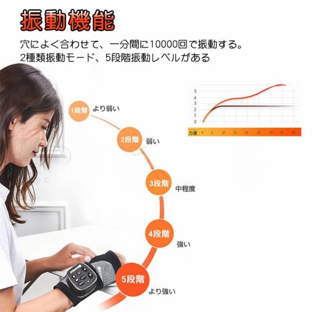 【振動機能、2種類モード、5段階調節可】振動機能にも付き、穴によく合わせて、一分間に10000回で振動し、手首をよくエア揉みリラックスする。振動モードはパルス式振動、連続式振動2種類があり簡単的に切り替え、振動レベルは5段階があり自由的に調節できる