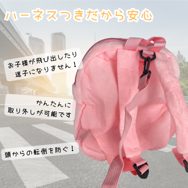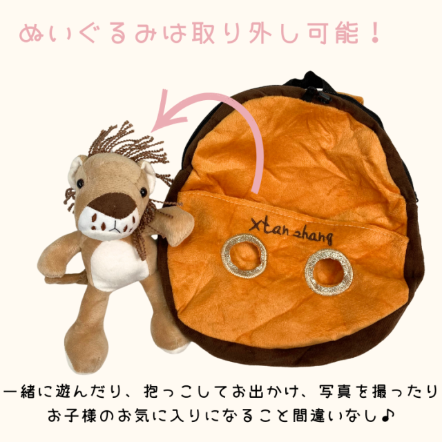 ・特徴:かわいい動物さんと一緒におでかけ♪ ハーネス付きでママも安心!ぬいぐるみの取り外し可能。