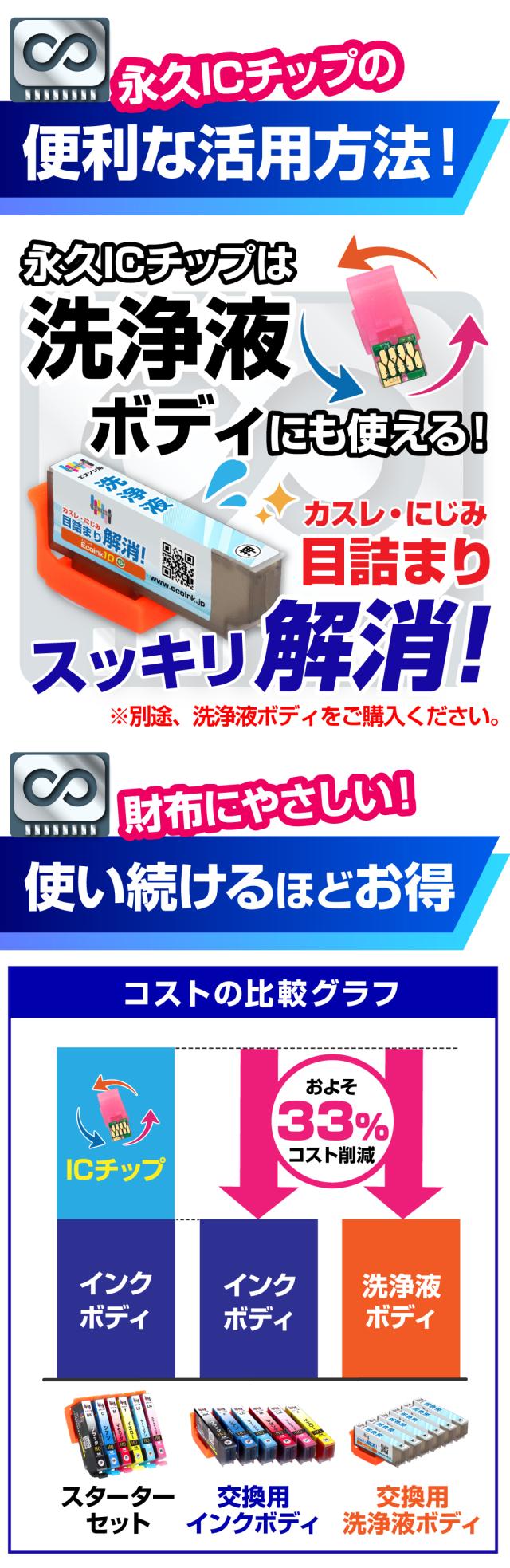 | 繰り返し使える永久ICチップを装着して使用する互換インクカートリッジです。 インクが無くなった際は、インクボディのみ(ICチップなし)を追加でご購入いただき、再度永久ICチップ付け替えることで、ご使用いただけます。 永久ICチップを繰り返し使用することでコストを削減し、環境にも経済的にも優しい商品です。ぜひお試しください。 | |
