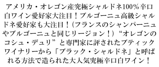 アメリカ・オレゴン産究極シャルドネ100%辛口 白ワイン愛好家大注目!ブルゴーニュ高級シャル ドネ愛好家も大注目!(フランスのシャンパーニュ やブルゴーニュと同じリージョン!)“オレゴンの コシュ・デュリ”と専門家に評されたブティック ワイナリーから「ブラック・シャルドネ」と呼ば れる方法で造られた大人気究極辛口白ワイン!