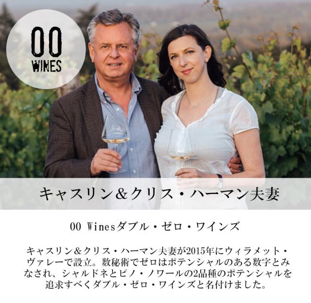 【生産者のダブル・ゼロ・ワインズは『キャスリン&クリス・ハーマン夫妻が2015年にウィラメット・ヴァレーで設立。数秘術でゼロはポテンシャルのある数字とみなされ、シャルドネとピノ・ノワールの2品種のポテンシャルを追求すべくダブル・ゼロ・ワインズと名付けました。自社畑は持たず、樹齢が古く興味深い区画を借りビオディナミを実践。ブルゴーニュとシャンパーニュでもワインを生産しています。プレス時の亜硫酸添加を避けフェノールを最大限抽出するため、一晩スキンコンタクトを行う「ブラック・シャルドネ・メソッド(ハイパーオキシデーション)」を取り入れ、リッチかつエレガントなワインを生み出しています。』