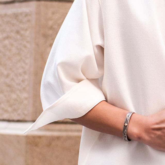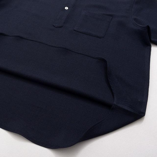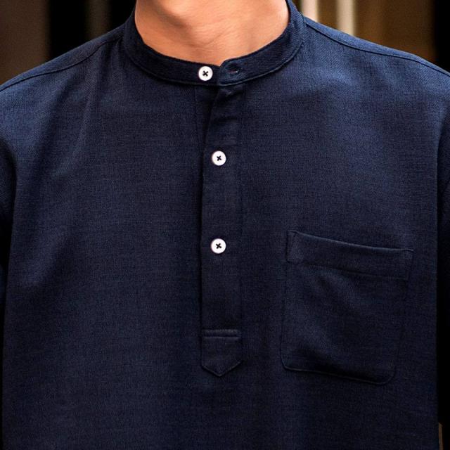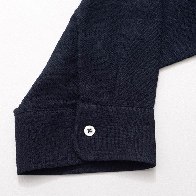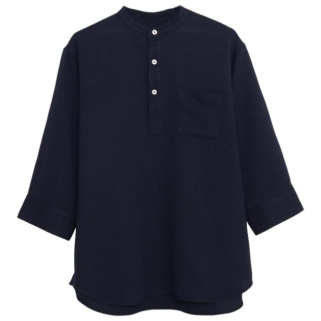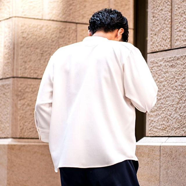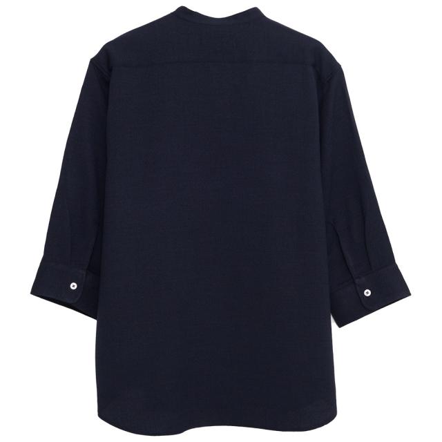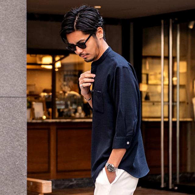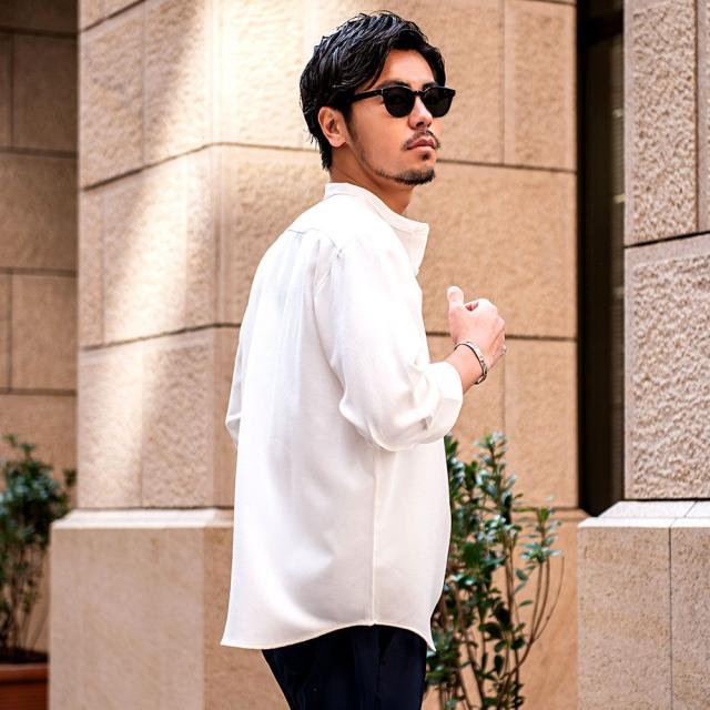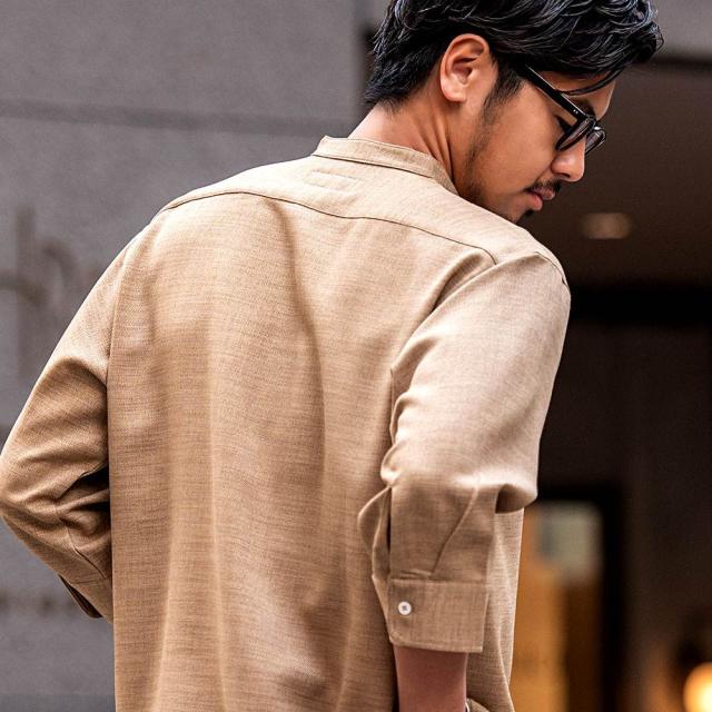 首元をすっきり見せるバンドカラーで、清潔感のある洗練された印象に。